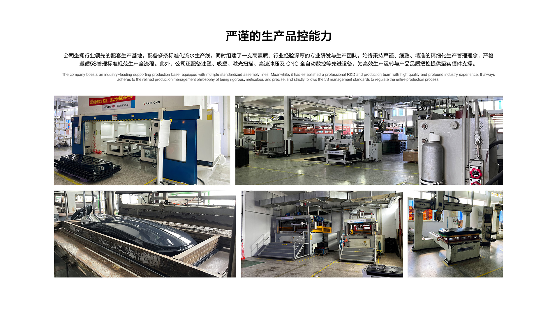 公司拥有行业领先的配套生产基地,多条标准化流水生产线,有一支高素质、行业经验丰富的研发和生产团队,我们采用严谨、细致、精准的生产管理理念,严格按照5S进行管理生产。同时公司拥有注塑吸塑、激光扫描、高速冲压和CNC全自动数控等先进设备。