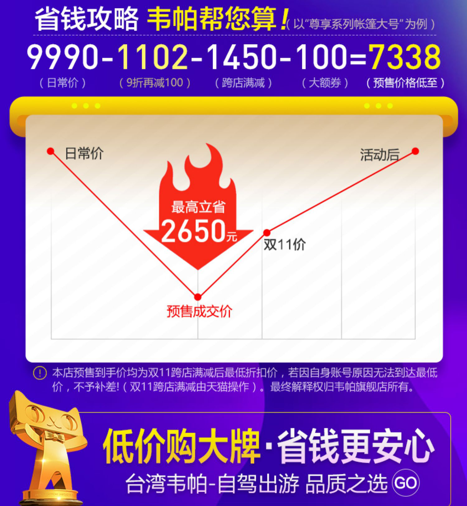 以韦帕一款热销车顶帐篷日常价9990元为例子,活动期间九折再减100元,跨店满减1450元,再减大额券100元。